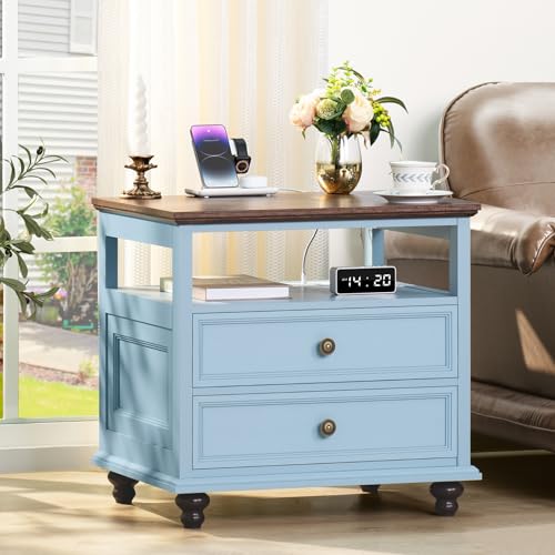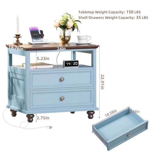 • Farmhouse Nightstand Set of 2 with Charging Station 24 Wide End Table with 2 DrawersLight Blue Dresser Cabinet for BedroomBed Side Table Chest of DrawersNight Stand for Living Room