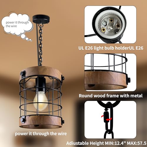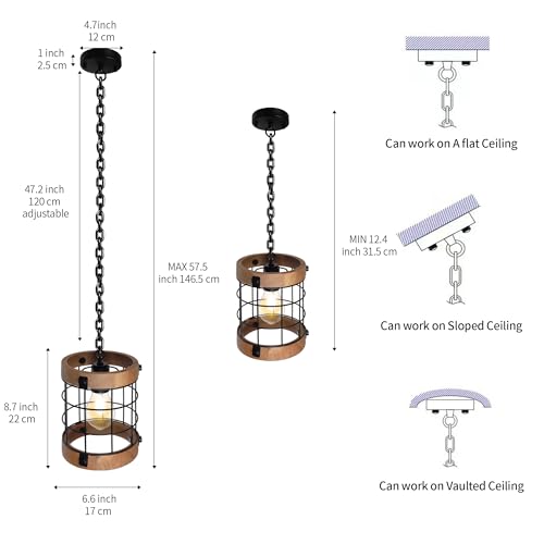 ENTRYWAY LIGHT FIXTURE: 7.9″ x 8.7″ 1-light vintage lights includes rubber pipes with 47.2″, then can adjust hanging light height as your request. wood & metal farmhouse pendant light will provide you with a higher light perception, stable and long-lasting lights