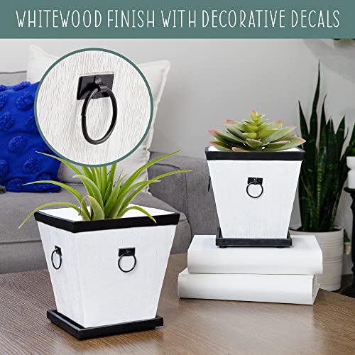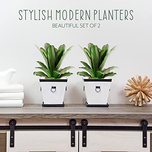 Farmhouse Resin Planters with Saucers (2-Pack); Retro Tudor Style White with Black Trim 1.5 Quart Square Planters and Trays