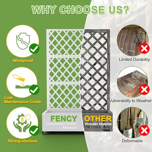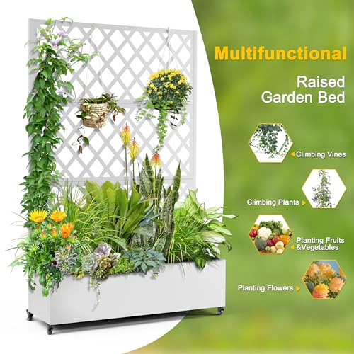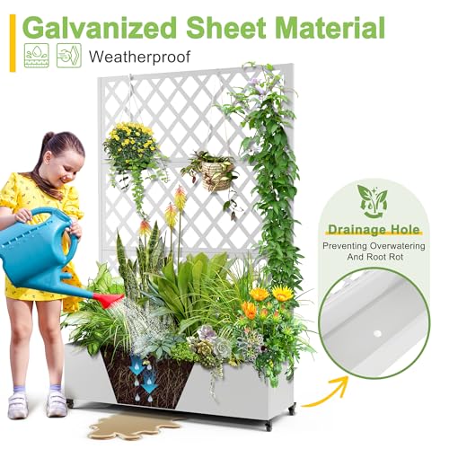 • FENCY Metal Planter Box with Diamond Lattice Trellis Planter Box for Climbing PlantsVines Galvanized Raised Garden Bed On Wheels Garden Bed with Trellis73x47 White