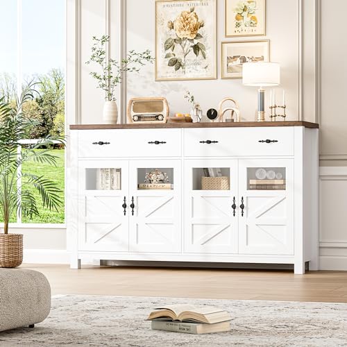 【Maximize Storage Space】The buffet cabinet with storage offers various storage options to keep your space free of clutter. The top of the FINETONES sideboard cabinet is perfect for items such as coffee pots, microwaves, potted plants, photo albums, etc. 2 large drawers keep smaller items organized. 2 glass door cabinets with adjustable shelves can store wine glasses, bottles, books, and other collectibles and show them off to friends. (Overall Size: 55.1 in x 15.4 in x 35.4 in)