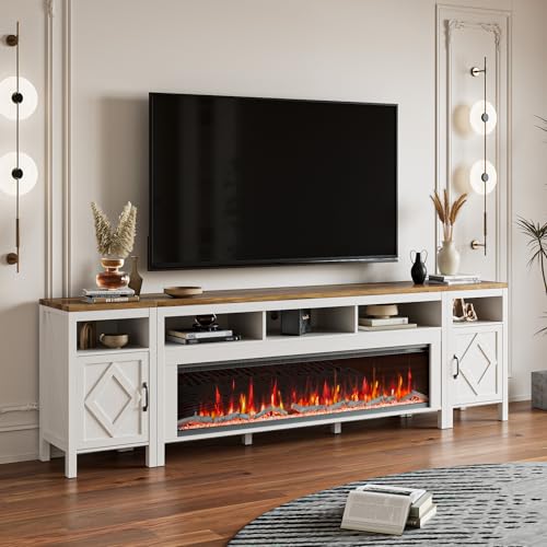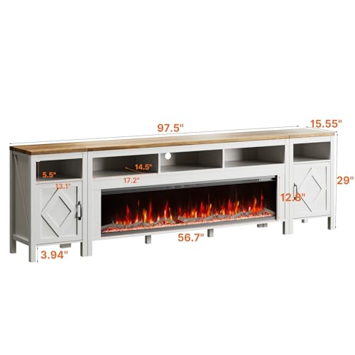 Fireplace TV Stand for TVs Up to 110 Inch,Farmhouse Entertainment Center with 60″ Electric Fireplace,White TV Console with Storage Cabinets for Living Room,Bedroom