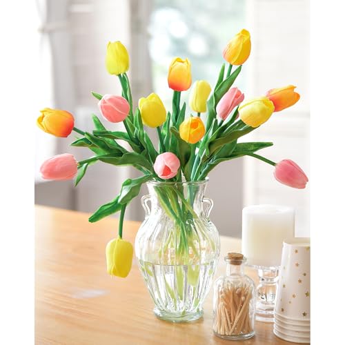 What’s inside: A bouquet of 15 artificial tulip stems (5 orange, 5 yellow, 5 pink) with a FiveSeasonStuff authenticity card and gift-Able packaging (vases & accessories in photos are for display only).