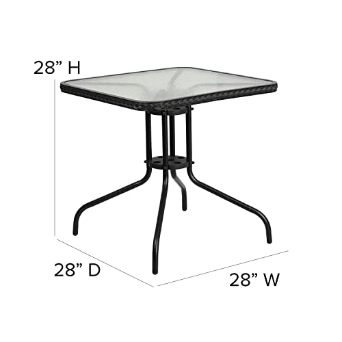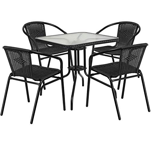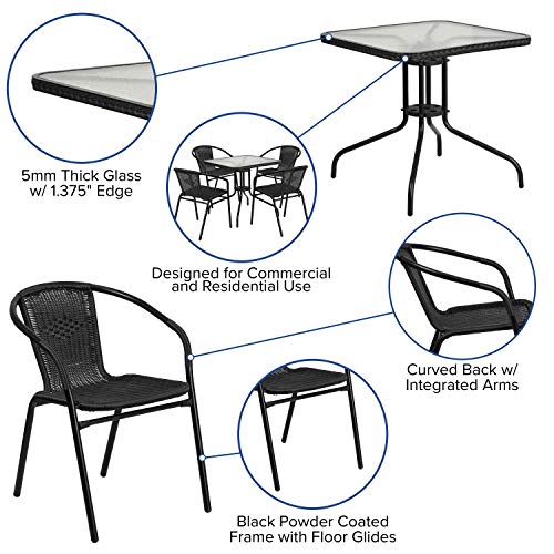 • Flash Furniture 5 Piece 28 Square IndoorOutdoor Patio Table and Chairs Set Dining Set with Glass Metal Bistro Table 4 Stack Rattan Chairs Black
