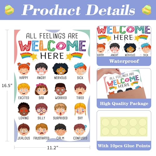 【Feelings Chart for Kids】: You are going to receive an 11.2″ x 16.5″ feelings poster and 10pcs of glue points, easy to install. Perfect back to school decorations for kindergarten preschool elementary bulletin board decorations.