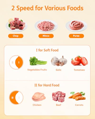 Versatile Cutting Adjustment: This meat grinders for home use has 2 speed options to meet your different processing needs for vegetable and meat processing. Speed Ⅰ is perfect for soft or small ingredients such as onions, garlic, speed Ⅱ is suitable for harder ingredients such as meat, even ice and baby food, the smart design of speed 1 and speed 2 controls the processing speed and effect.