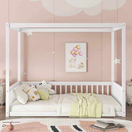 Enchanting Canopy Design: This full-size floor bed features a wooden canopy frame with slide rails, allowing you so as to add curtains, bunting, or fairy lights to create a cozy, intimate sleeping space for your child.