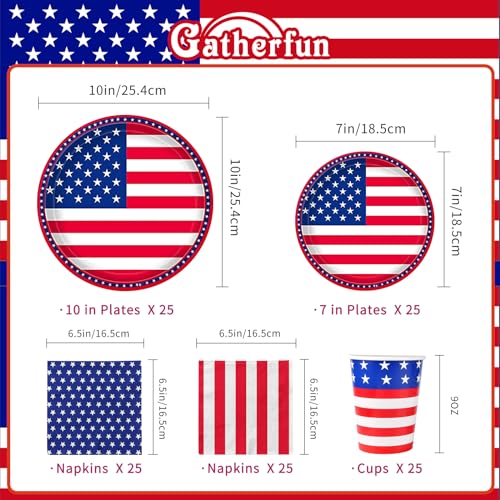 AMERICAN FLAG PARTY PACKAGE INCLUDING: 25*dinner paper plates (10.5 inches), 25*dessert paper plates (7inches), 25* the celebrities napkins (folded: 6.5*6.5inches), 25* the stripes napkins (folded: 6.5*6.5inches), 25*paper cups (9oz)