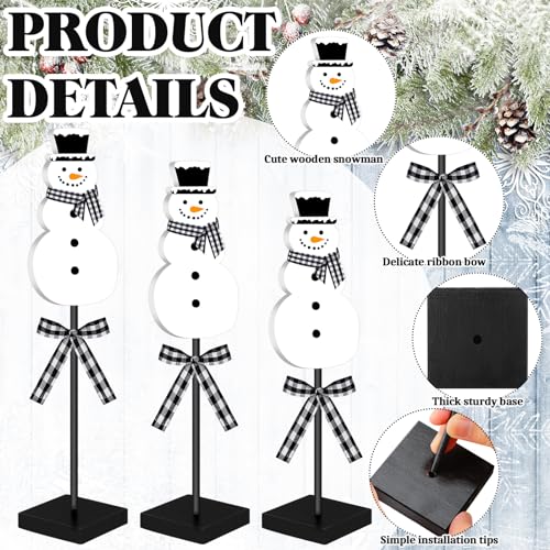 Winter Snowman Decorations: you’re going to receive 3 pieces of winter table decor in a unified snowman theme, consisting of snowman ornaments in the white and black colors, standing bases and black white checkered ribbon bows, suitable for decorating your home tables or tired trays on winter holidays