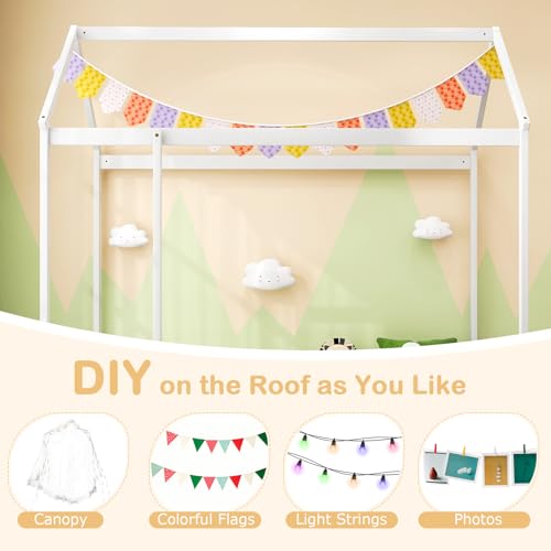 [DIY on the Roof as You Like]: Grow to be your child’s room into a magical haven with our twin size house bed! It features a customizable roof design, allowing you to adorn the bars with canopy, colorful flags, light strings, and photos (not included) to create a dreamy sleeping environment.