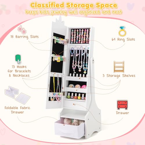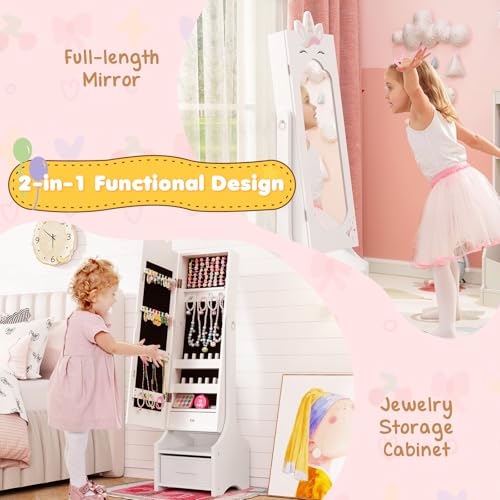 GLACER Kids Jewelry Armoire Cabinet with Full-Length Mirror, Standing Children Jewelry Organizer with Foldable Drawer, 2 Adjustable Tilt Angles, Princess Dress Up Jewelry Cabinet for Girls (White)