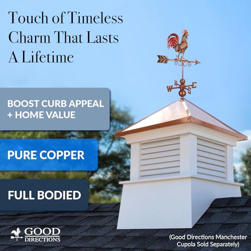 Crafted with an intricate attention to detail, our Bantam Red Rooster weathervane hearkens back to a more practical time. Since 1982 Good Directions pure copper weathervanes have been unsurpassed in style, quality, and durability – best possible for the home-proud homeowner. Weathervanes are easy-to-assemble and install. Includes an assembly rod, solid brass 15″L directional, and globes. A 401AL Roof Mount is beneficial to mount your weathervane for your rooftop, sold one by one.