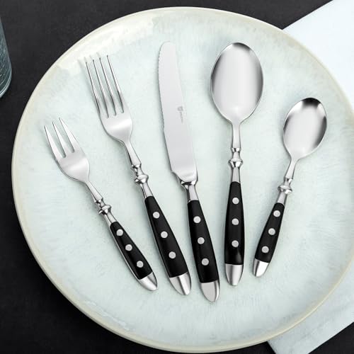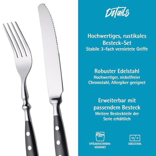 The forged table cutlery with black triple-riveted plastic handles is durable and has a high own weight. The cutlery pieces fit comfortably in the hand and make allowance comfortable dining