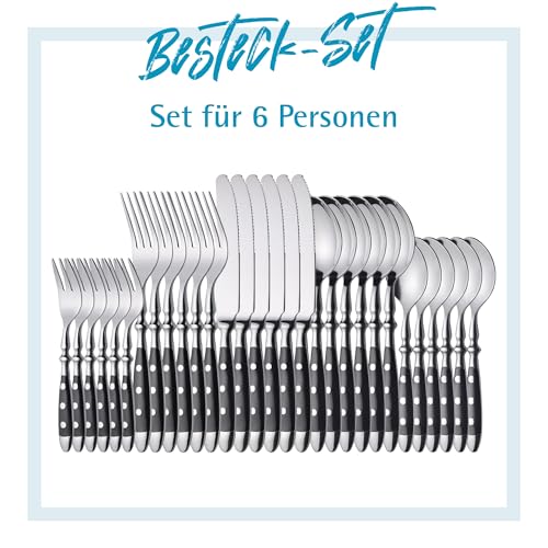 GRÄWE 30-piece table cutlery for 6 persons, series “NÜRNBERG”, black High-quality cutlery for 6 persons in forged quality, which is equally suitable for setting the table at festive occasions as for on a regular basis use. As a result of the high material thickness, the cutlery pieces lie comfortably in the hand. The cutlery set can also be expanded at any time with matching menu, serving and special cutlery from the GRÄWE “NÜRNBERG” cutlery series. All handles are reworked by hand, so there could also be slight variations between the individual pieces. Forged Material: 18/0 stainless steel (chrome steel) Nickel-free Stainless Dishwasher protected Rustic country house/bistro style With black handles High-quality rivets made of stainless steel Expandable with matching pieces from the GRÄWE cutlery series “NÜRNBERG” Scope of delivery: 6 menu knives with serrated edge Length approx. 8.5 inch, weight approx. 2.4 oz 6 menu forks Length approx. 7.9 inch 6 menu spoons Length approx. 7.7 inch cm 6 coffee spoons Length approx. 6.1 inch 6 cake forks Length approx. 6.1 inch