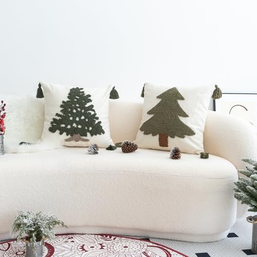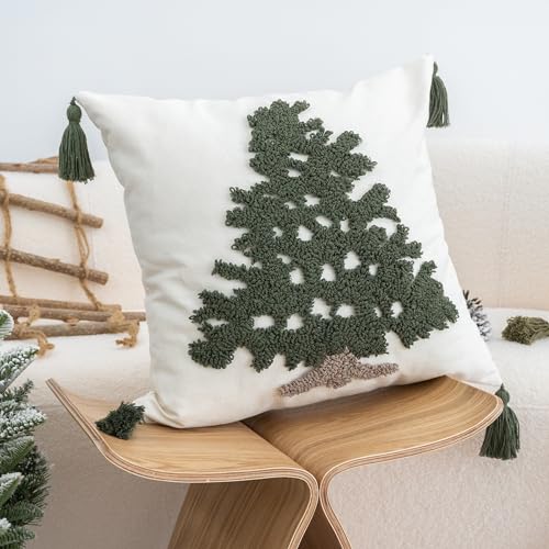 Classic Festival Designs: embrace the coming winter holiday with these tufted designed seasonal throw pillow covers, in both emerald and sage green, combined with light gray and brown, together resembling traditional fir or pine trees on the front, featured with four cute soft tassels, similar to vivid evergreen trees brought to life on your sofa couch or bed
