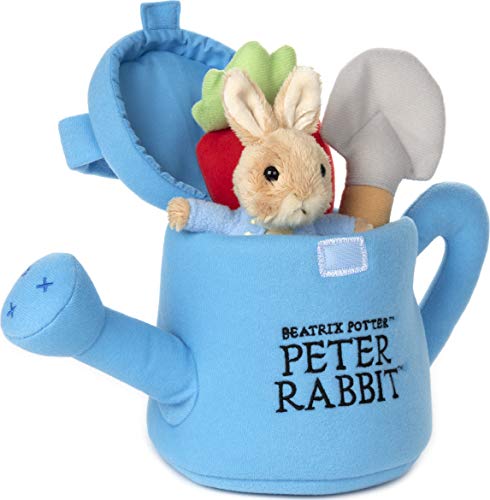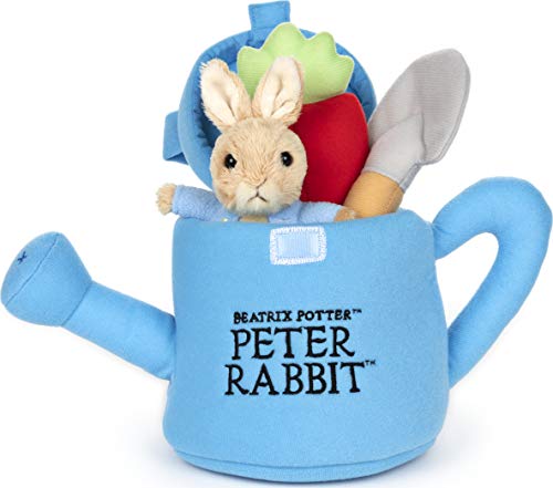 PETER RABBIT GARDEN PLAYSET: Have fun within the garden with Peter! This Peter Rabbit four-piece playset includes a shovel with satisfying crinkle, rattle carrot plush, and Peter Rabbit plush held inside of a soft, blue watering can carry case with hook-and-loop fastener.