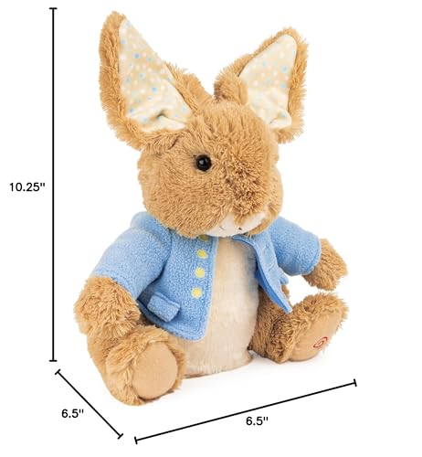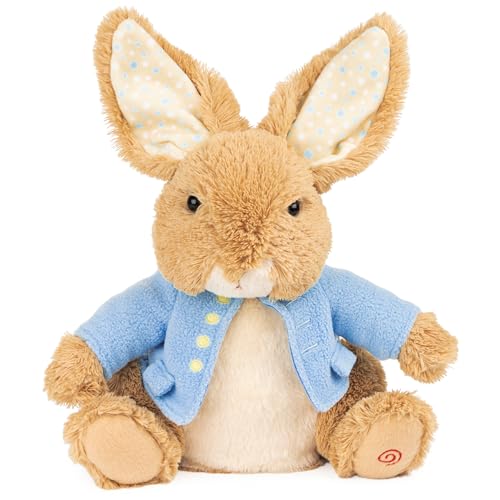 Shop classic characters from the beloved illustrated world of Beatrix Potter. Beatrix Potter’s beloved character, Peter Rabbit, is celebrating his 120th anniversary! Celebrate with this special animated Peek-a-Ears Peter Rabbit, who’s in a position to play a game of peek-a-boo with you! This 11” classically designed animated Peter Rabbit plush features Peter’s well-known blue jacket and oversized moveable ears, which activate when the button in his left foot is pressed. Peter hides in the back of his ears before moving back up to surprise and delight children with an interactive game of peek-a-boo. All the way through play, Peter also says playful phrases with his adorable British accent! This Peter Rabbit plush toy is surface-washable for easy cleaning and appropriate for ages one and up. Each interactive plush also requires three AA batteries to operate (included).