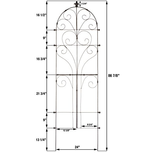 Powder coated finish – Weather resistant, the trellis stands strong by itself or secured to a wall, adding grace to your garden even without a plant on it. With its charcoal brown powder-coating, a faux hand-rubbed finish has been applied for aesthetic, rustic appeal. Ideal for summer to fortify flowering vines, and in fall or winter, to add architectural interest to your lawn decor.