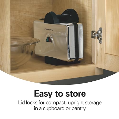 Easy to Store: The lid locks for compact, upright storage of waffle maker in a cupboard or pantry