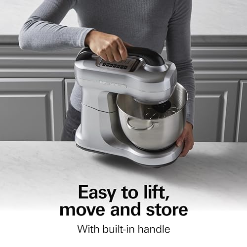 The Hamilton Beach® Stand Mixer easily handles ingredients for homemade baked goods. It has 7 speeds, a slower first speed to reduce splatter and a mixing guide. It features a 4 quart stainless steel bowl, splash guard, dough hook and flat beater.