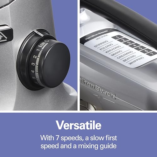 VERSATILE — 7 SPEEDS, SLOW FIRST SPEED & MIXING GUIDE: A helpful guide on top of the electric mixer helps you select the right speed for the job. The slow first speed is great for kneading bread and reducing splatter when adding dry ingredients to wet ingredients.