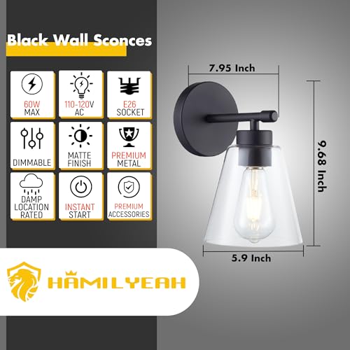 Hamilyeah Black Bathroom Sconces Wall Lighting, Farmhouse Wall Sconces Set of 2, Industrial Black Sconces with Clear Glass Shade for Living Room, Kitchen, Hallway