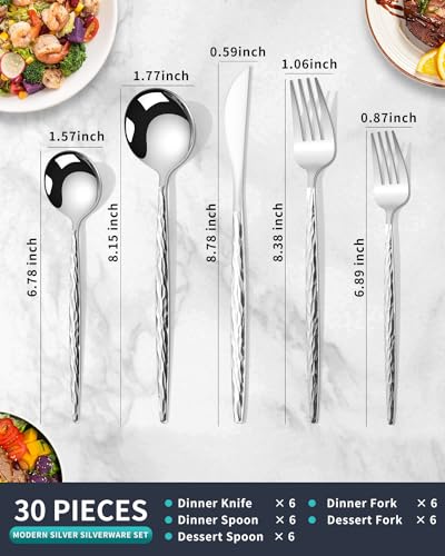 30 Pieces Set:The silverware set for 6,includes 6 dinner knife,6 dinner fork,6 dinner spoon,6 dessert fork,6 dessert spoon