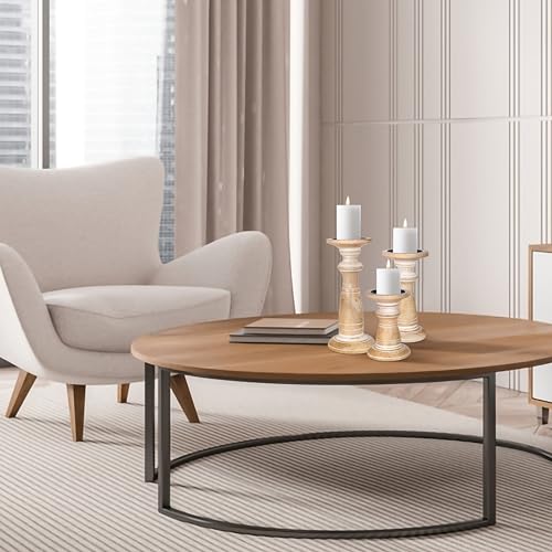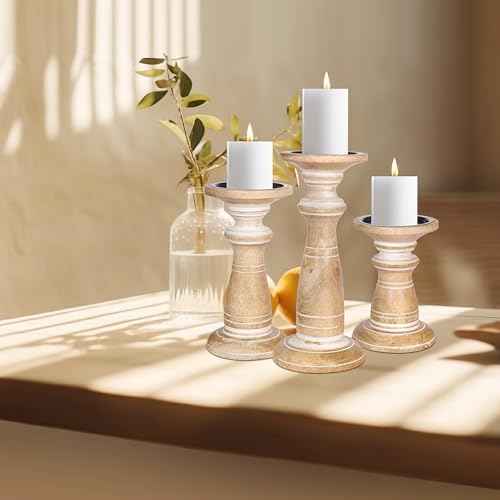 Handcrafted of sustainable gorgeously grained mango picket that has a time worn look, the set offers 3 variations of turned columns. Featuring graceful designs of traditional farmhouse elegance, this set of 3 home made turned picket candle pillars will showcase your pillar and votive wax candles. Perfectly sized for dinner conversations.
