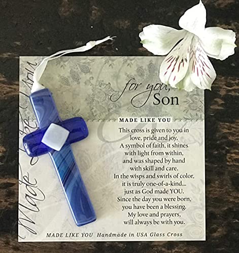Handcrafted in USA, beautiful blue glass cross with Made Like You sentiment makes highest gift for son from parents