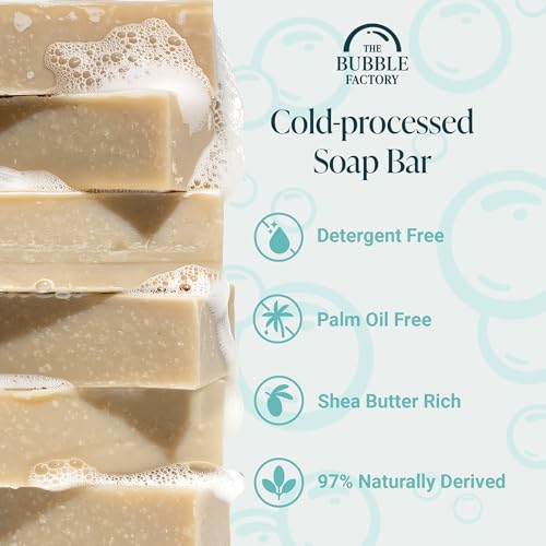 PALM OIL FREE: The Bubble Factory bar soap is crafted in a Cosmetic GMP Certified facility with natural ingredients. Free from harsh chemicals like SLS, phthalates, and parabens. Palm oil free, vegan, cruelty-free, detergent free, chemical free, non-toxic, and gluten-free soap that is 97% naturally derived (even for the most sensitive of skin). Each moisturizing bar can last up to 4 weeks with proper drying care and moderate consistent daily use