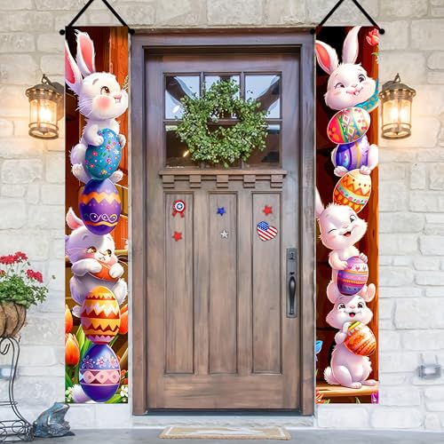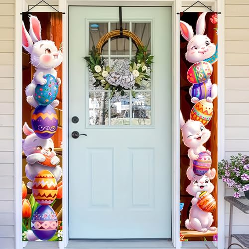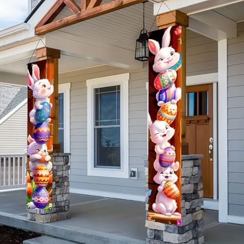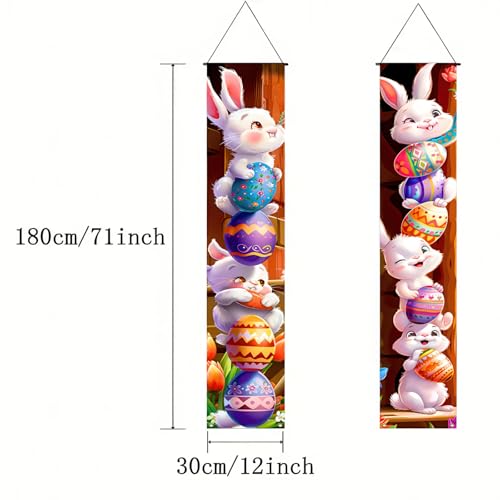 Charming Easter Bunny Design:Featuring playful bunnies stacking colorful eggs, this easter porch banner adds a festive and cheerful touch on your Easter decorations for homes or parties.
