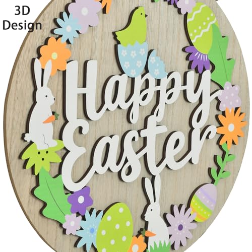 MULTI-DIMENSIONAL ELEGANCE: Elevate your décor with a 2-layer 3D structure featuring a round natural wood grain background as the very best canvas. The highest layer of this easter door decoration showcases a brush-lettering style “Happy Easter” quote, encircled by a wooden wreath adorned with adorable bunnies, Easter eggs, and flowers—creating a visual masterpiece.