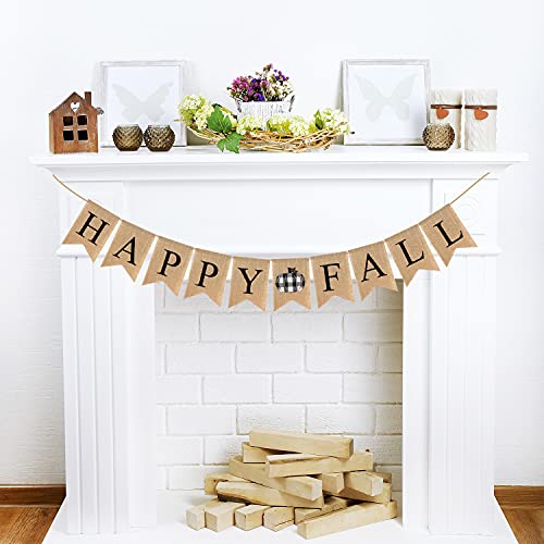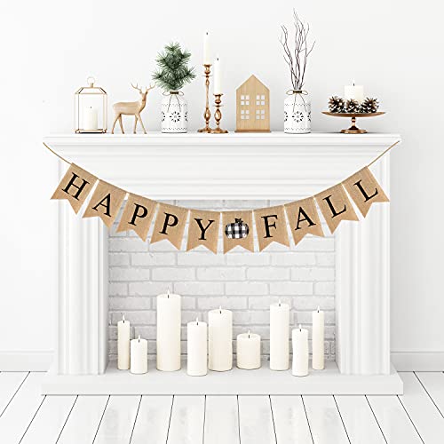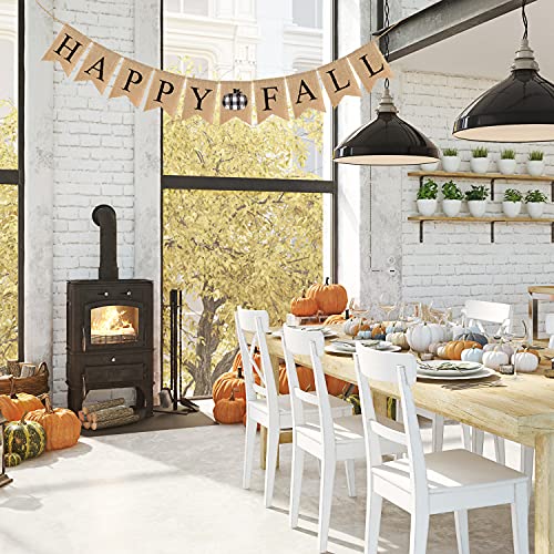 • Happy Fall Burlap Banner Buffalo Check Plaid Jute Burlap Pumpkin Garland Harvest Mantel Fireplace Wall Hanging for Home Office School Party Decor Thanksgiving Decoration