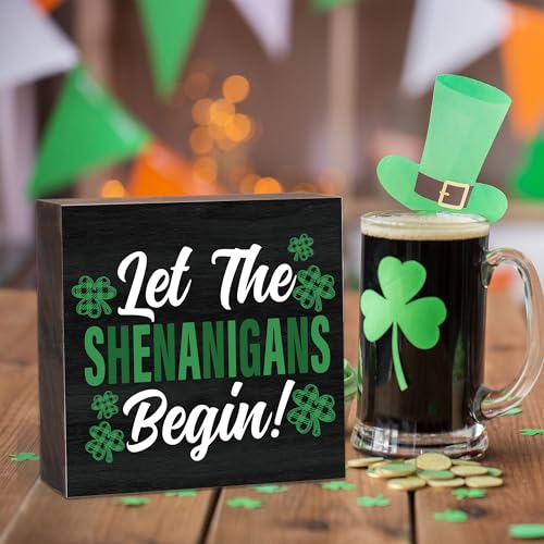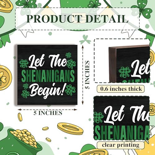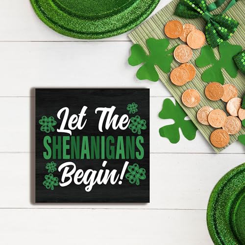 Happy St. Patricks Day Decoration, Let the Shenanigans Begin Wooden Sign, Blessing Decor, Home Tabletop Shelf Desk Decor 5 x 5 Inches, St Patricks Day Decorations-A09