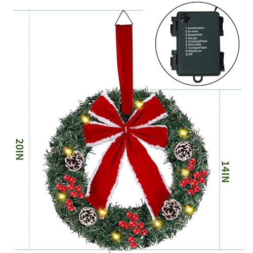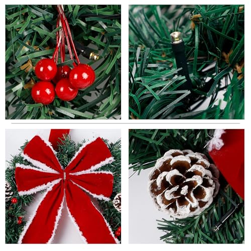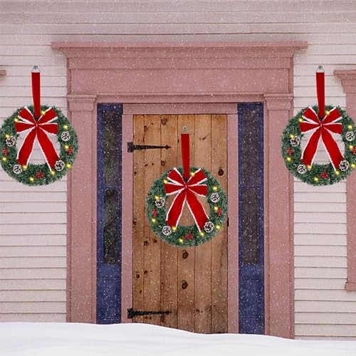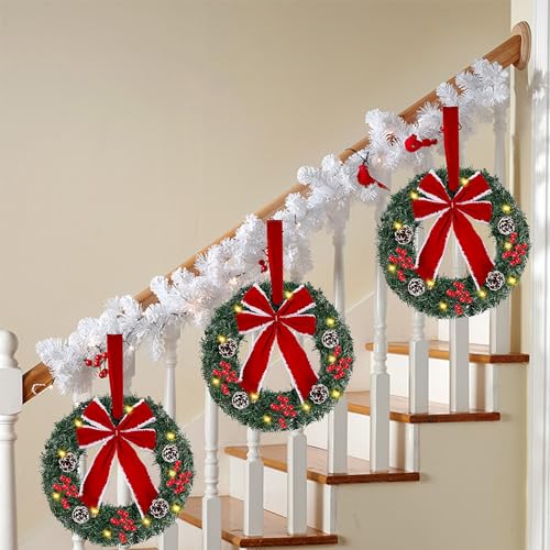 • Hausse Set of 3 Christmas Wreaths Lighted Artificial Christmas Wreath with LED Lights Large Red Bow Ornaments 8 Modes Timer Battery Operated for Front Door Gate Wall Xmas Party Decorations