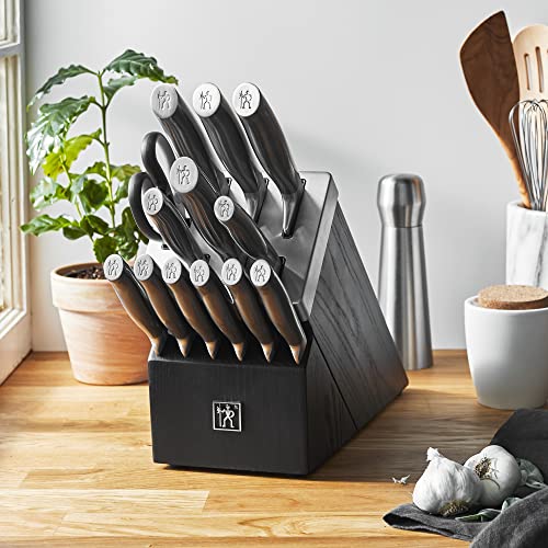 Sharpness is at all times within reach with Henckels self-sharpening Graphite knife blocks. The self-sharpening slots boast built-in ceramic honing wheels that automatically sharpen when knives are stored or removed. The remaining slots are for serrated knives, with toothed blades that never need sharpening. The 14-piece block set features all of the knives you wish to have to set your kitchen up right. From the 3-inch paring for smaller scale jobs to the all-rounder 8-inch chef’s knife for slicing and dicing, this set contains the key knives for all tasks, at the side of kitchen shears and 6 ultra-sharp steak knives.Sleek and elegant, the Graphite cutlery line features a completely forged bolster construction that seamlessly transitions from blade to care for for durability, balance, and superior design. Fabricated from high-quality German stainless steel, the satin-finished blade produces precision cuts and is honed for long-lasting sharpness. Contoured for comfort, the smooth care for is designed for fatigue-free cutting. It has a handsome, stainless steel end cap stamped with HENCKELS’ single man logo, a Halberdier, who stands for the brand’s superior quality at an exceptional value. These dishwasher protected knives make clean up a cinch.