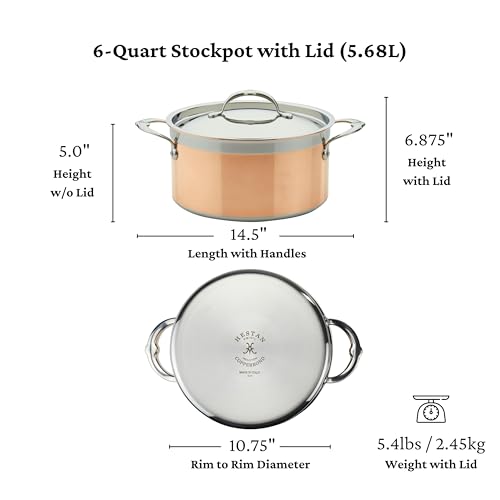 Includes – (1) Hestan CopperBond 6 quart Stock Pot. Handcrafted in Italy with an entire life warranty; hand-wash and dry with a soft cloth; 10.75″ diameter, 5″ deep, 6.88″ tall with lid, 14.5″ long overall with handles