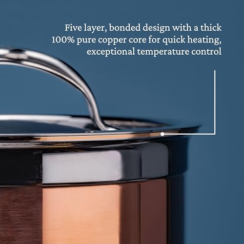 5-layer bonded construction with a thick 100% pure copper core for quick heating, exceptional temperature regulate and even heat distribution. Rated as “Best Overall” copper cookware by the Food Network!