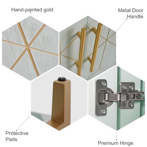Vintage Design: The cabinets are in fresh green with elegant gold accents. The artisan hand-traced gold geometric shapes make each and every cabinet elegant and vivid.
