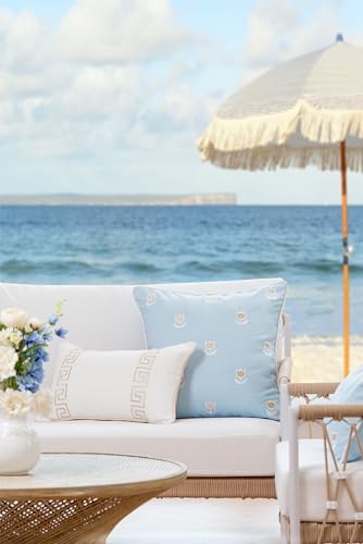 Coastal Chic Charm: With its embroidered neutral tan Greek key pattern on a crisp white background, this Out of doors lumbar pillow captures the essence of coastal style. The addition of neutral tan piping adds a subtle touch of texture, enhancing its charm.Perfect for spring, summer, fall and coastal decor.