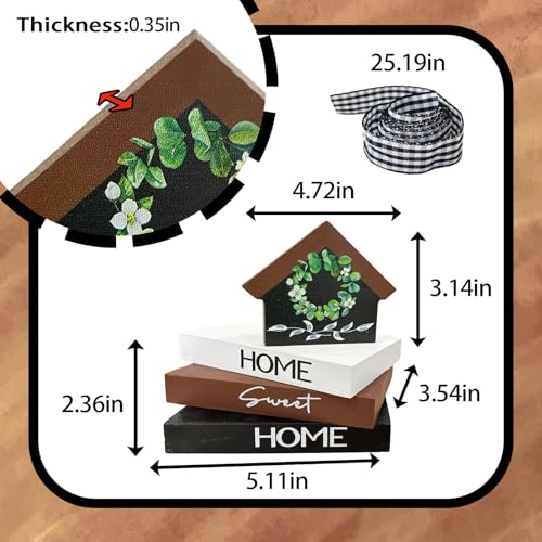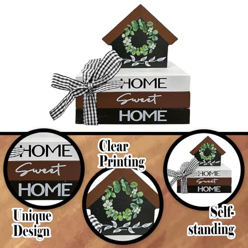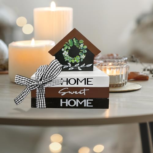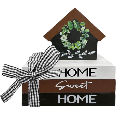 Package Including: You are going to receive 5 pieces of wooden book decor in different styles, 1 piece of home sign with wreath and 3 pieces of stacked books decor of the same size but different styles, which are tied along side black white checkered bow. This wooden book stacks decor is print with the words “home sweet home” on the spine, which is perfect for your tiered tray decoration in on a regular basis life