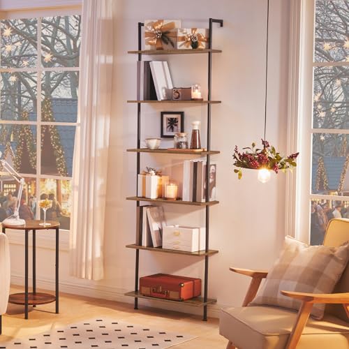 HOOBRO DIY Ladder Shelf, 6-Tier Wall Mounted Bookshelf, Office Vertical Bookcase, Wooden Storage Shelves for Home Office, Bedroom, Rustic Brown and Black BF65CJ01