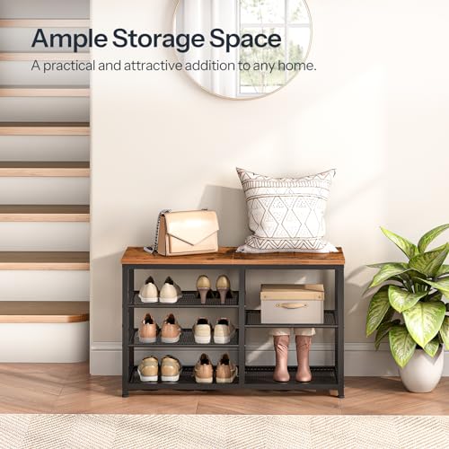 Spacious Storage: With dimensions of 31.5″L x 11″W x 19.7″H, the shoe bench features a wide top and a dual-row multi-tier shelving underneath, accommodating 9-10 pairs of shoes and boots. It quickly tidies your house and clears away shoe clutter
