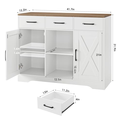 STABLE STRUCTURE: Made of high-grade manufactured wood and robust metal care for, this buffet cabinet with drawers boasts superior durability and stability to resist the years of time. And with a solid base, the table surface can improve up to 250 lbs. Overall size: 15.2″D x 41.7″W x 31.9″H