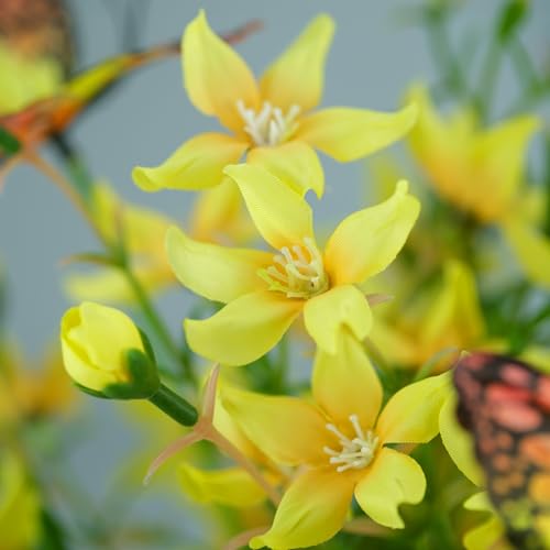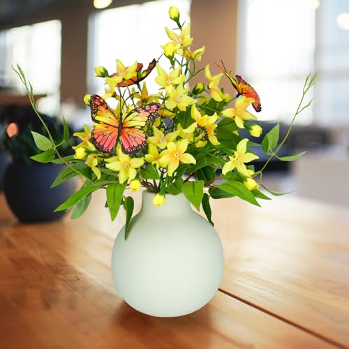 Embrace the wonderful thing about nature in its full bloom with the HOSY Artificial Yellow Freesia Bouquet. This stunning arrangement, featuring 54 vibrant yellow freesias and lush green leaves, is further enhanced with the enchanting presence of three lifelike butterflies. Housed in a realistic ivory ceramic vase with a faux soil bottom, this bouquet exudes charm and sophistication.