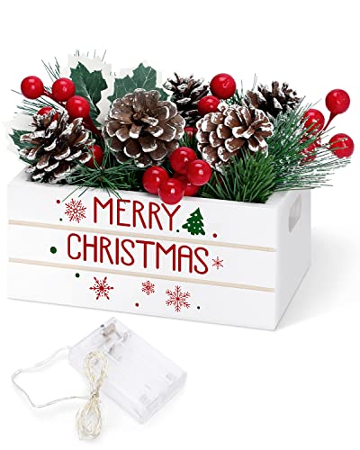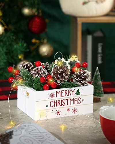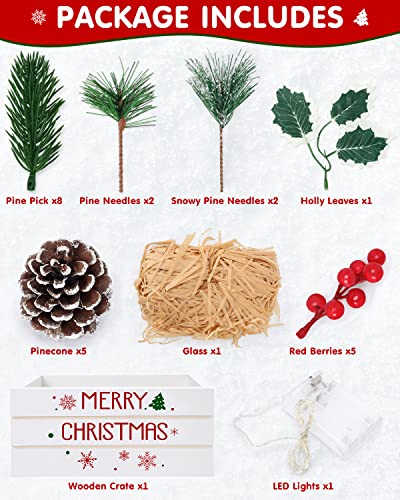 PACKAGE INCLUDES – Our Christmas wooden crate set comes with a mini wooden crate, 5 red berries, 8 pine picks, 2 pine needles, 2 snowy pine needles, 1 holly leaf, 5 pinecones, LED lights (with the exception of batteries), and grass. The wooden crate measures 6.3×4.5×2.7inches(LxWxH).