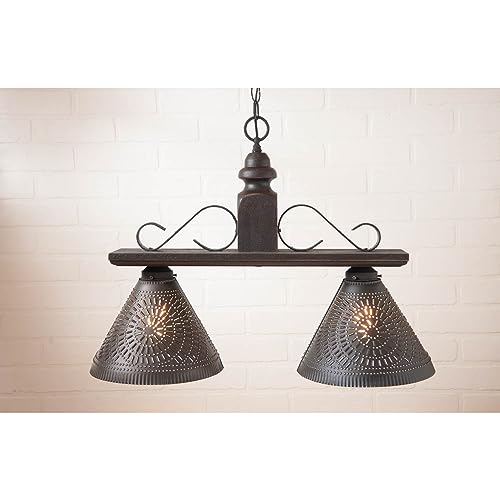 Our Medium Wellington Light is a stately commanding light for you to grace any living area of your house. Chosen so much incessantly for within the kitchen over the island or sink area, the Wellington Light also works well for within the game room or over a table. Featuring heavy wood crossbar with wrought iron scroll brackets, the Medium Wellington Hanging Light is accented with Kettle Black sun shades. Direct stressed out with two E26/Medium (Same old) sockets, 60 watts max per socket. Includes 3 feet of chain, 7 feet of wire, and a matching ceiling plate kit. Additional chain is also ordered. Textured Black over Red body color. Handcrafted in Pennsylvania. This light is UL-CUL listed and has a 5 year guarantee.