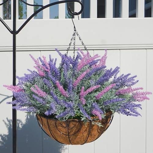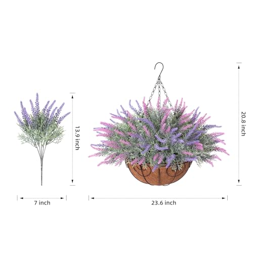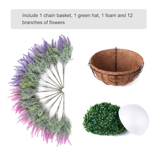 The pot size is 12″ x 12″ x 6″ (LxWxH) with a 13.5-inch chain, and the assembled size is approximately 13″ x 13″ x 19.5″ (LxWxH). The package includes 12 branches of lavender flowers with leaves, hemispherical foam, a leaves hat , and a basket, allowing you to create unique flower arrangements.