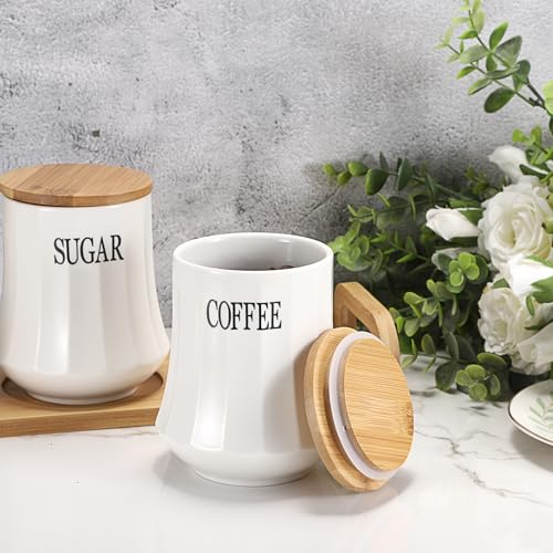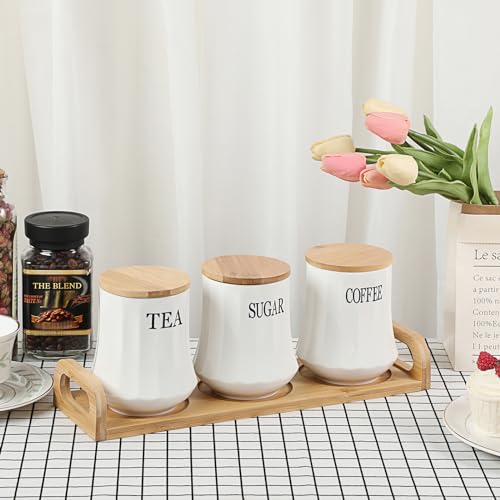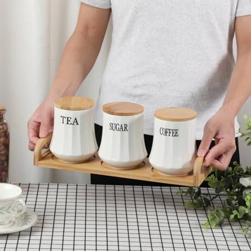 Luxurious coffee tea sugar container set is made of smooth thickened ceramic, bamboo lid with seal ring. Bamboo handled serving tray make it easier to transport from the kitchen to the dining table, buffet or where they are needed.