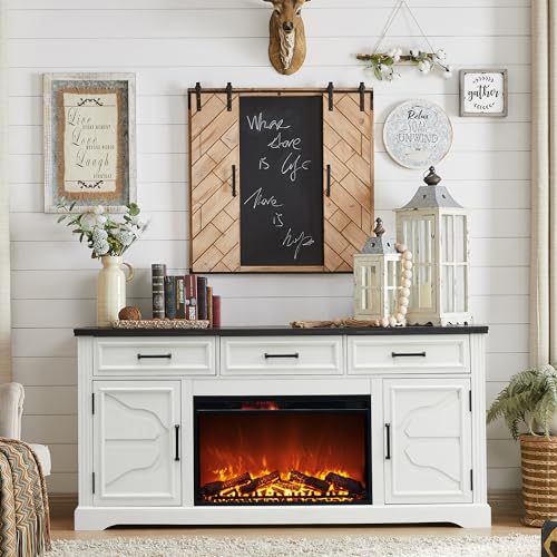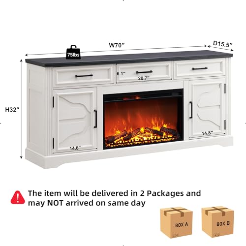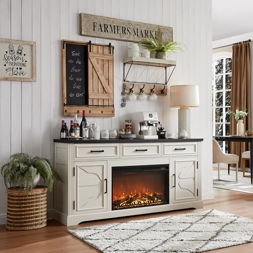JXQTLINGMU 70″ Large Farmhouse Buffet Sideboard Cabinet with Fireplace, Coffee Bar with 3 Drawers&2 Doors, 32″ Tall Kitchen Cabinet, Off White